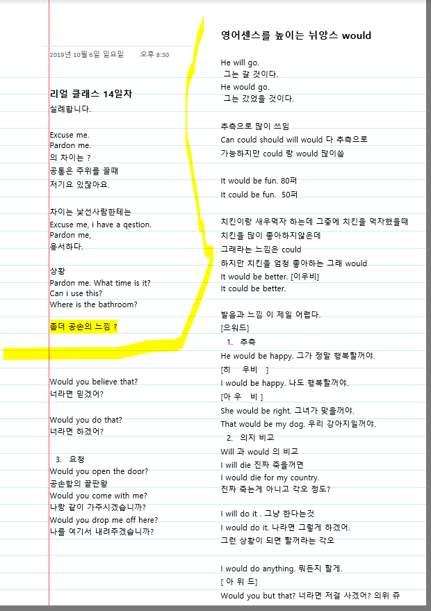 | 회화 - 리얼클래스 11일차 , 영어센스를 높이는 뉘앙스 could (0) | 2019.10.03 |