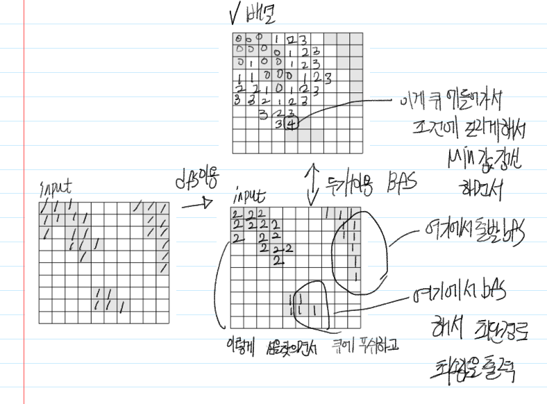 그섬에서 큐를 돌리면서 제일먼저 섬에 도달했을때의 cnt값 즉 최단거리의 최소를 출력하면됩니다.