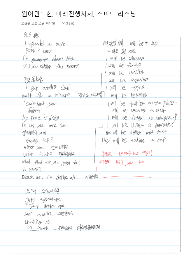 | 회화 - 오늘의 원어민표현 3가지, 시제 연습, 스피드리스닝 훈련 (0) | 2019.11.13 |