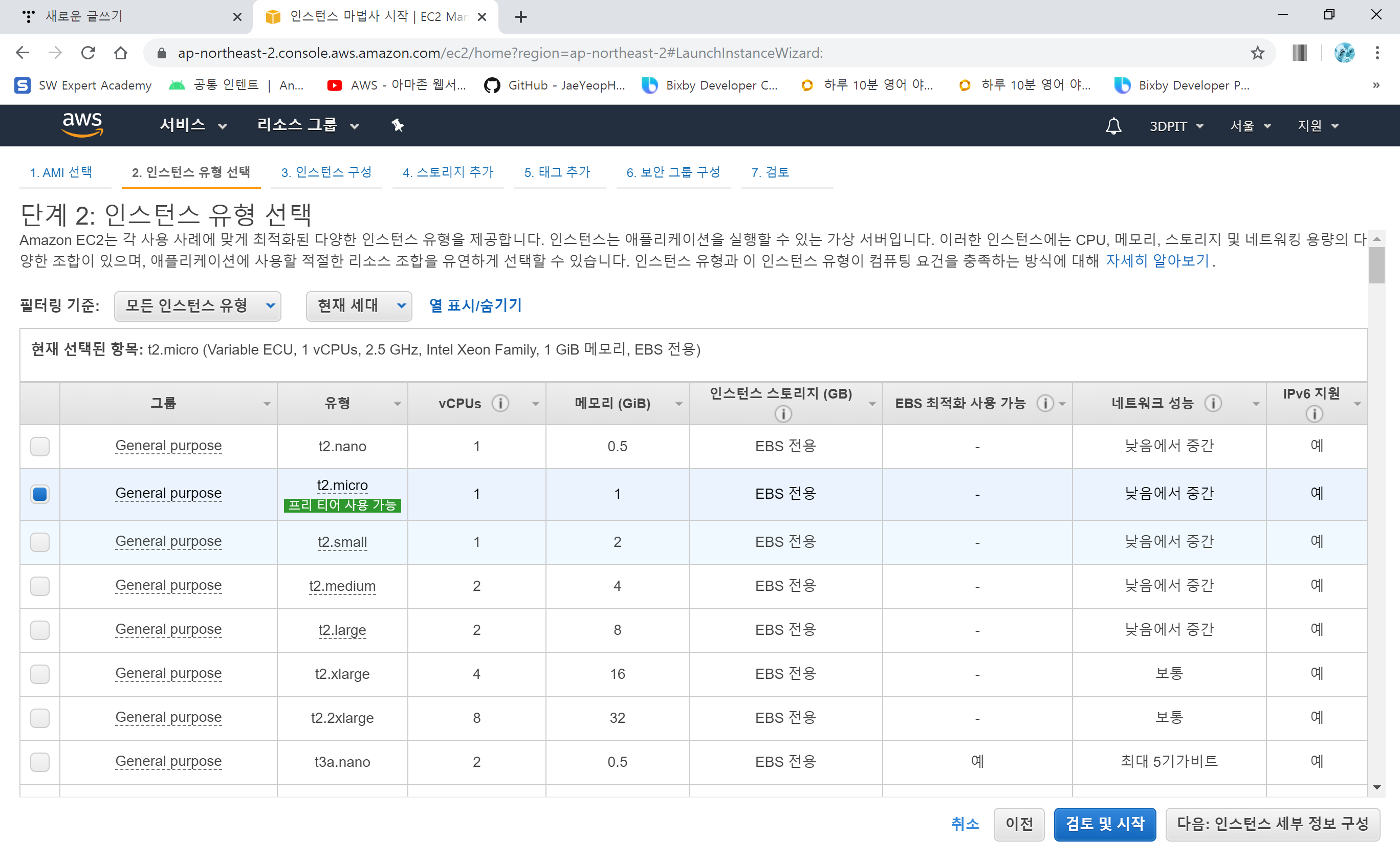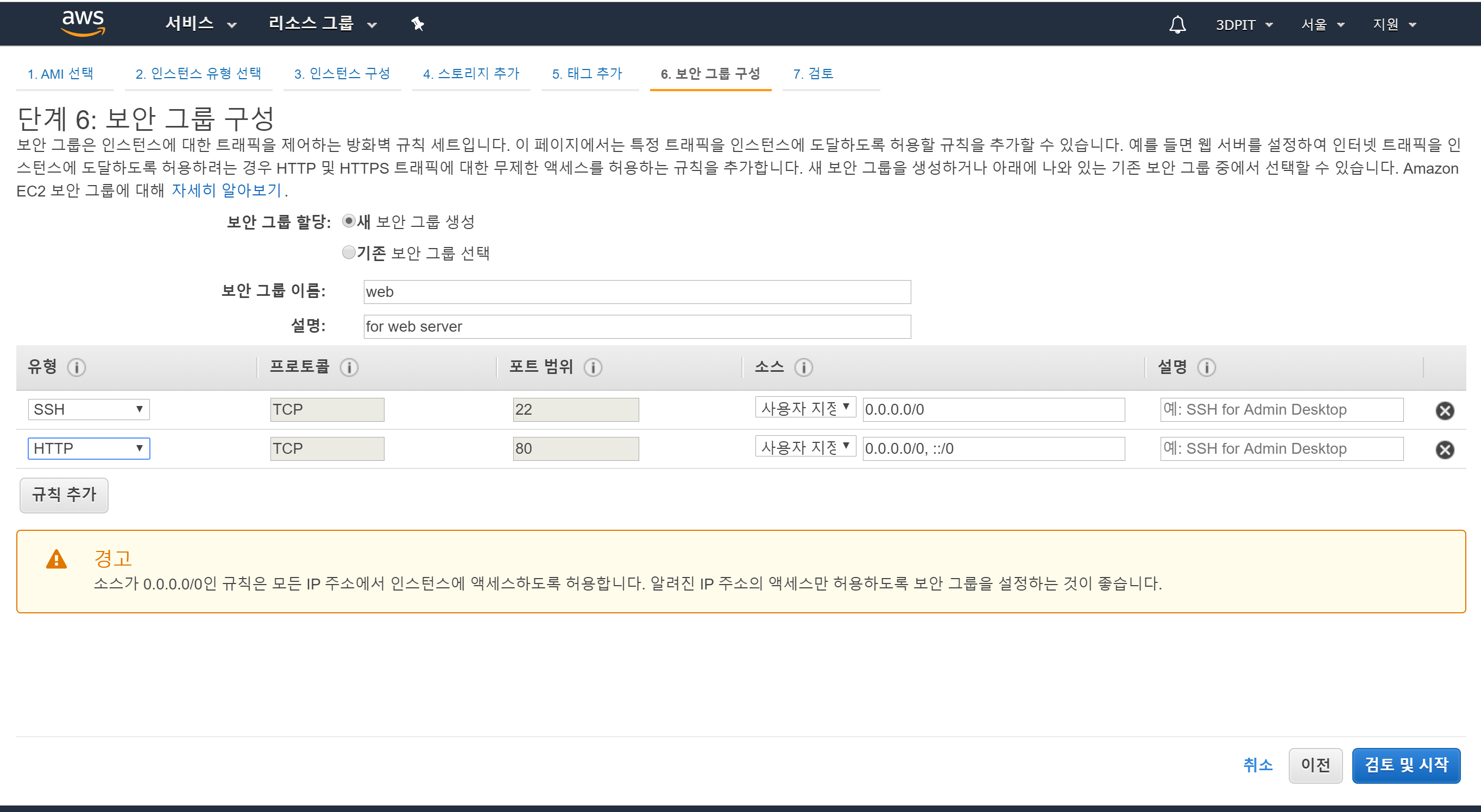 이페이지는 현재 우리가 설정한 값을 다시한번더 확인하는것입니다. 현재 우리가 유형은 어떻게 보안 그룹은 어떻게 사용하려고 설정했는지 확인하고 맞다면 시작하기를 눌러주시면 됩니다.