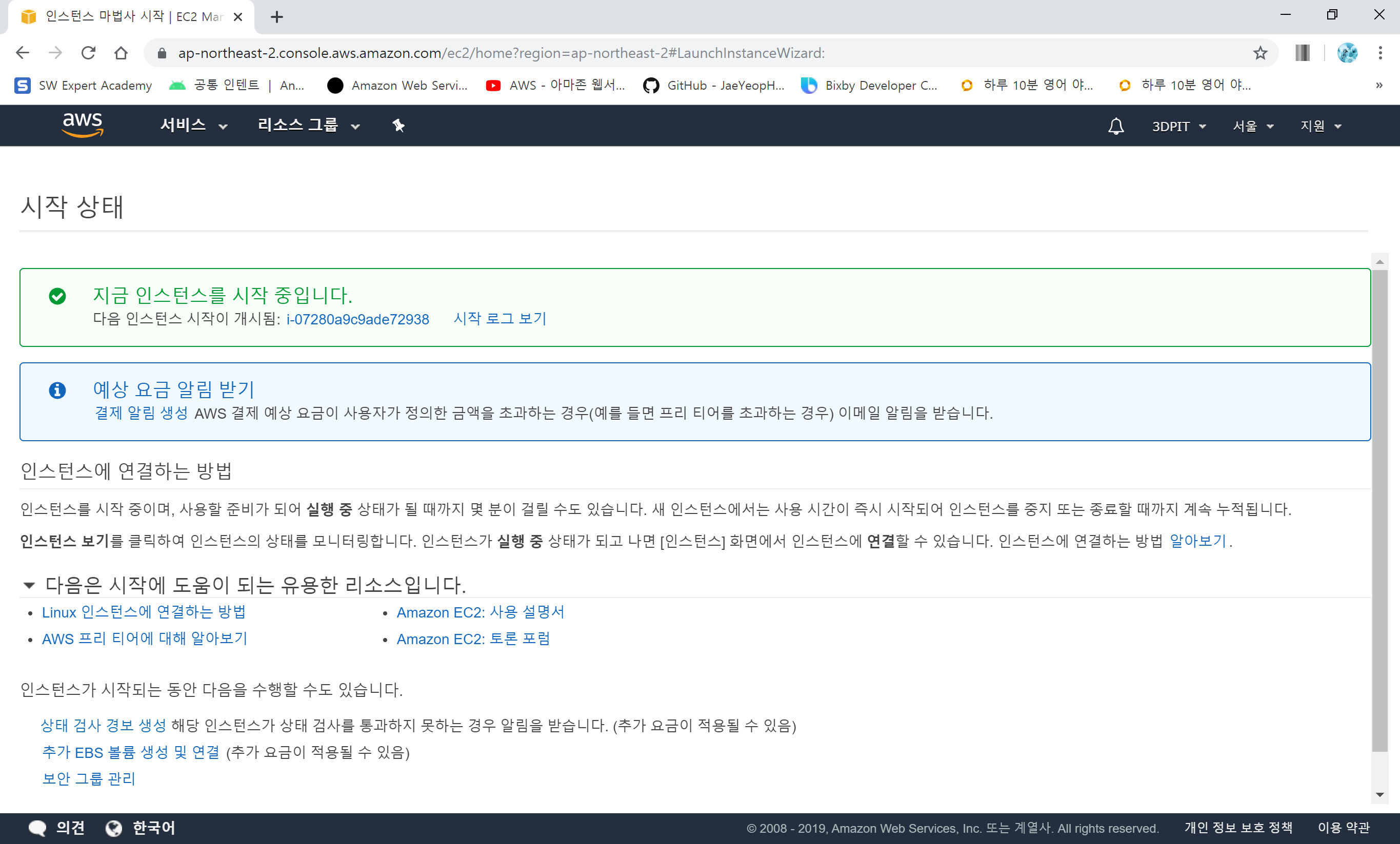 그리고 넘어가면 저렇게 지금 인스턴스를 시작 중입니다. 아래세 영어로 되어있는 파란 글씨를 누르면
