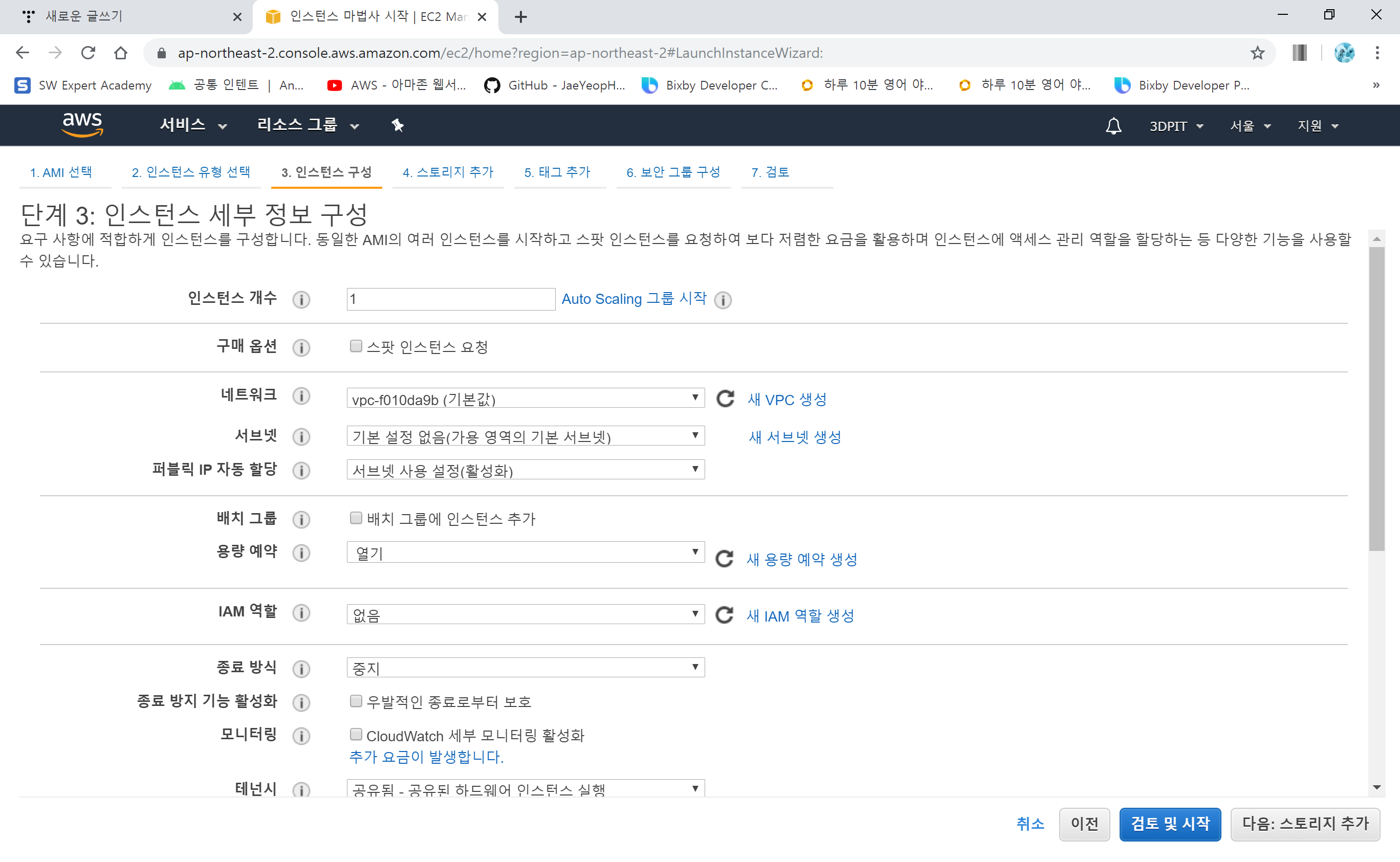 여기서는 인스턴스의 갯수 내가 필요한 컴퓨터의 갯수 부터 네트워크를 어떻게 설정할 것인지