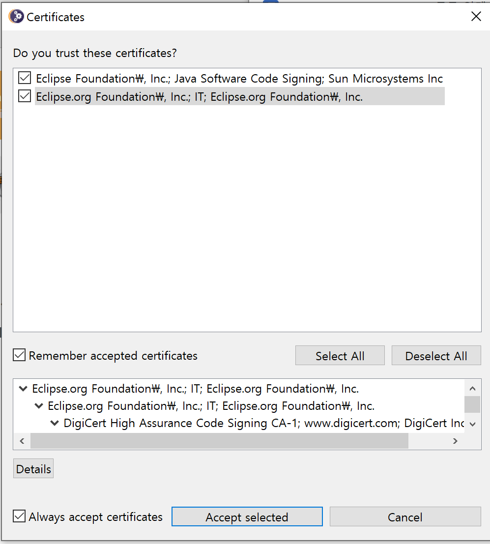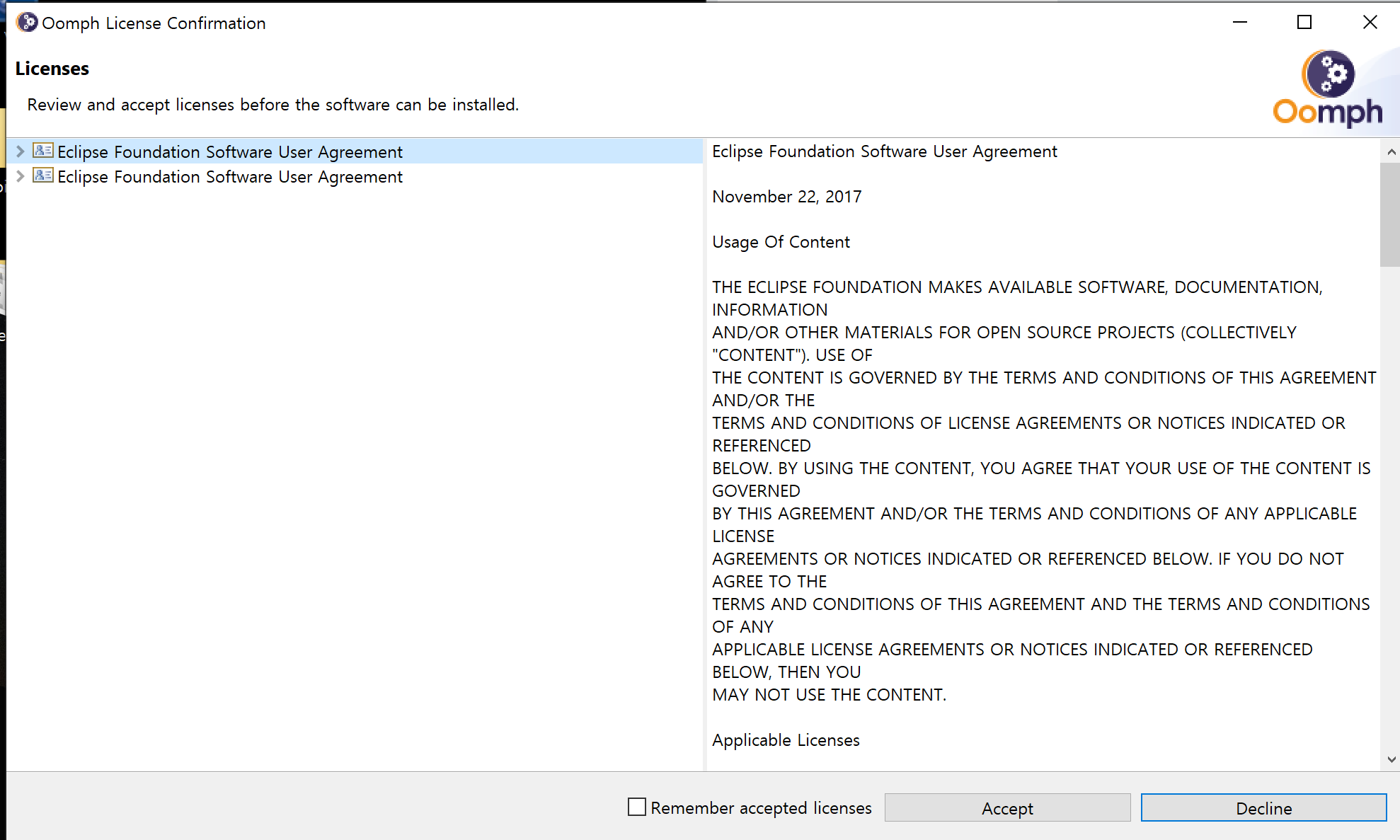 그냥 Remember accepted licenses 클릭 후 Accept를 눌러주세요 그리고 기다려주시면됩니다.