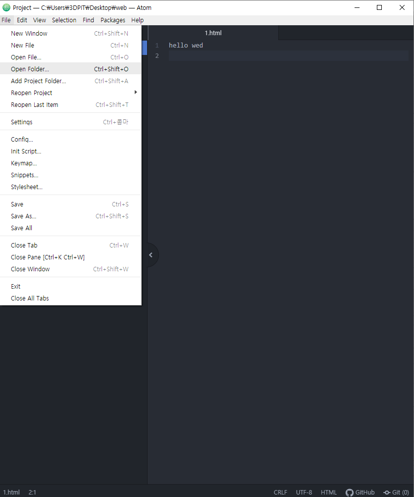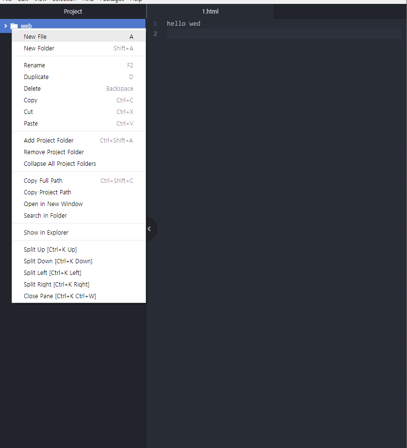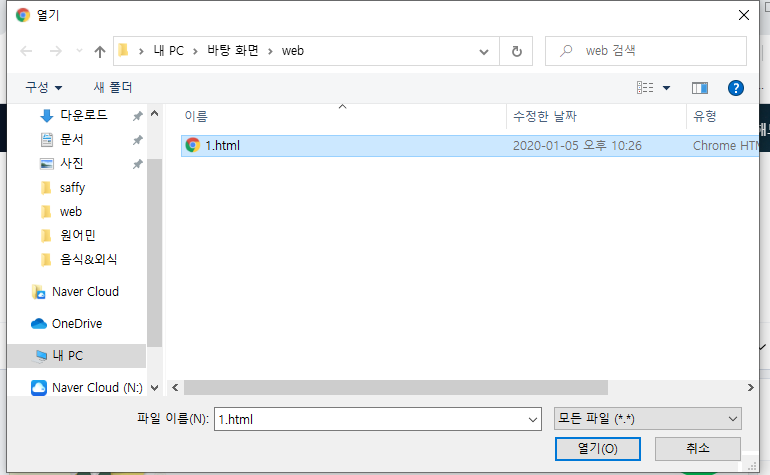 ctrl + o 단축키를 누르고 생성한 1.html를 열어줍니다.