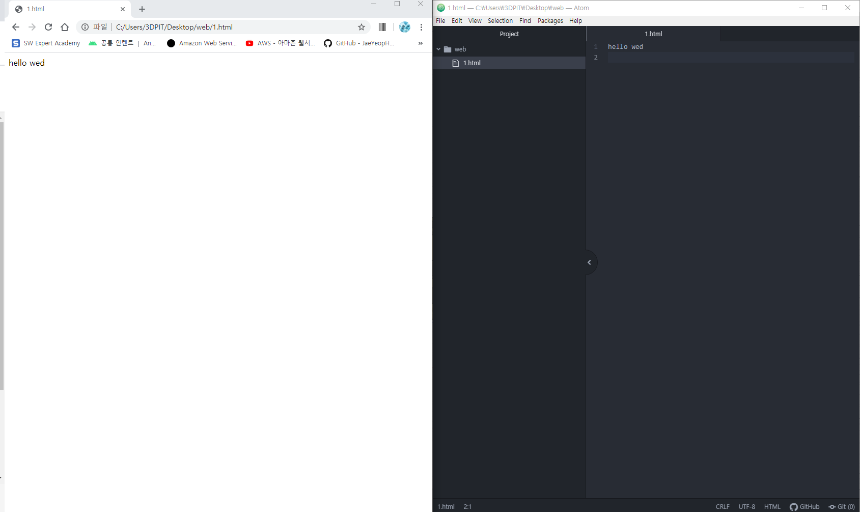 그리고 1. html에 hello wed 이나 글씨를 쓰고 현재 켜져있는 인터넷 창을 새로 고침해보세요 그러면 글씨가 나옵니다.