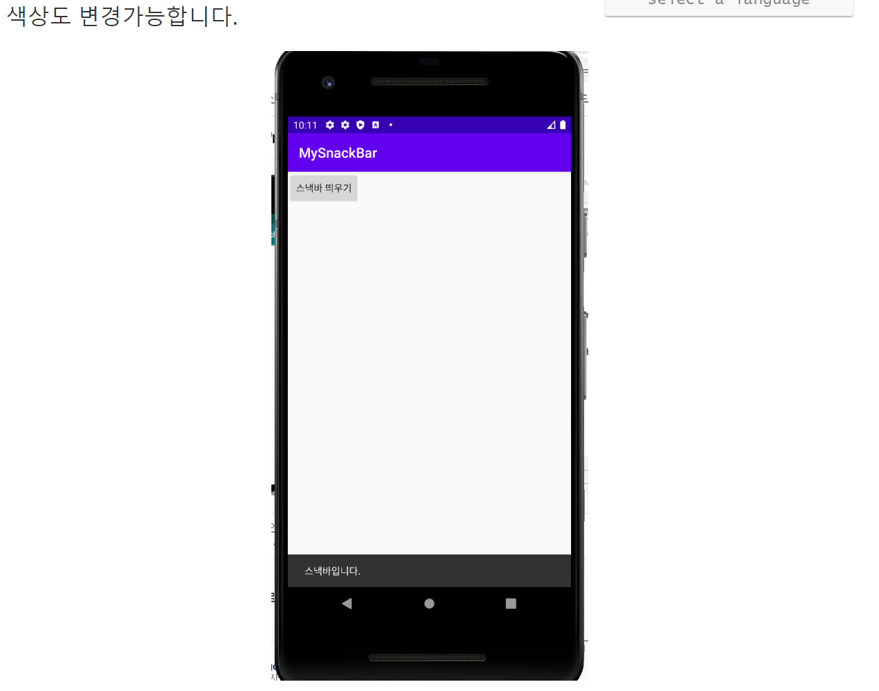 Snackbar.make(v,"스낵바입니다.",Snackbar.LENGTH_SHORT).show();