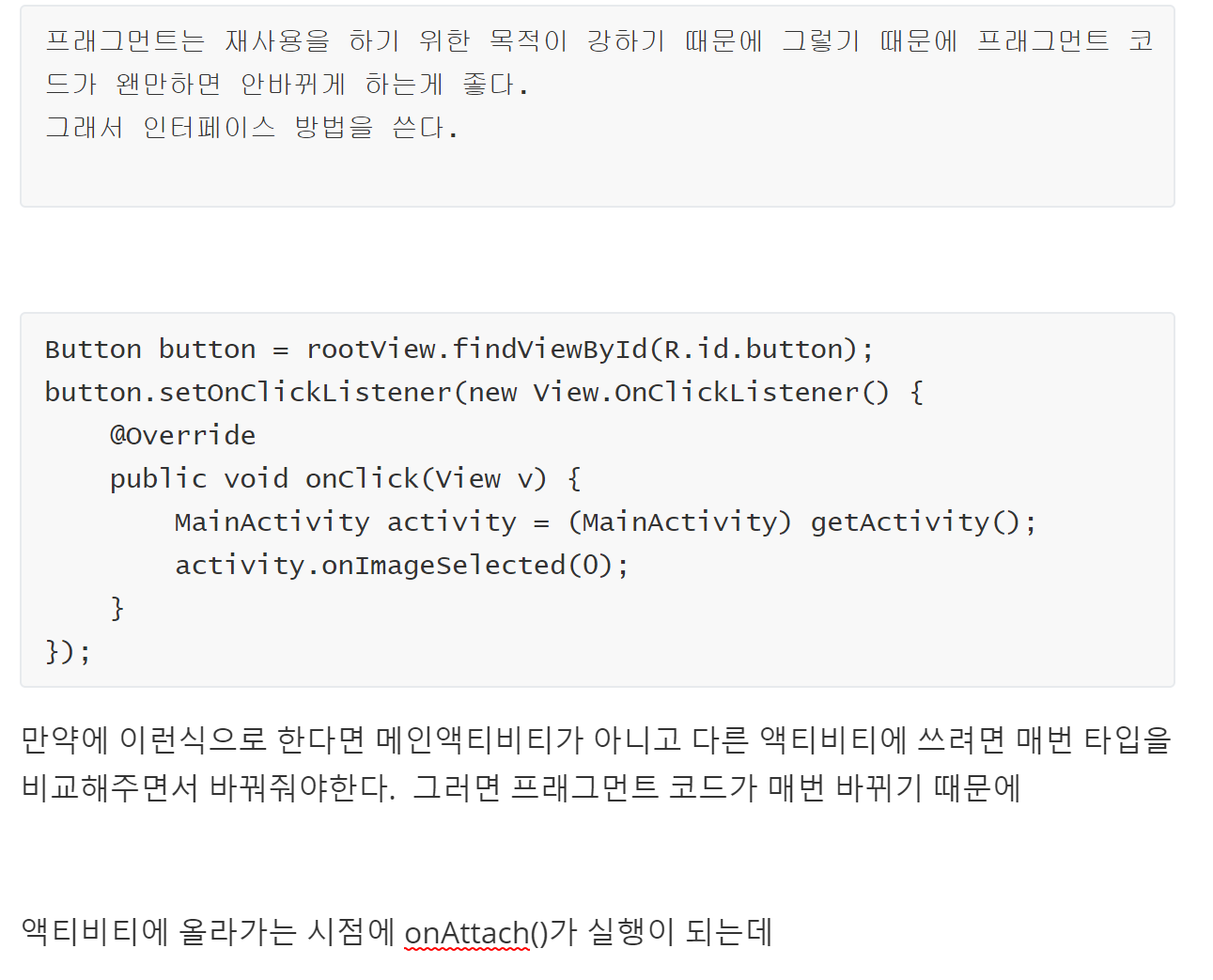 //onAttach에서 받아지는 부분이 현재 프래그먼트가 띄워지는 액티비티