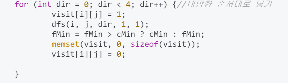 이부분에서 visit[i][j]=1 와 visit[i][j]=0 을 해주는 부분을 for 문 밖에다 했었다. 이런 실수 하지 않길 빌겟습니다.