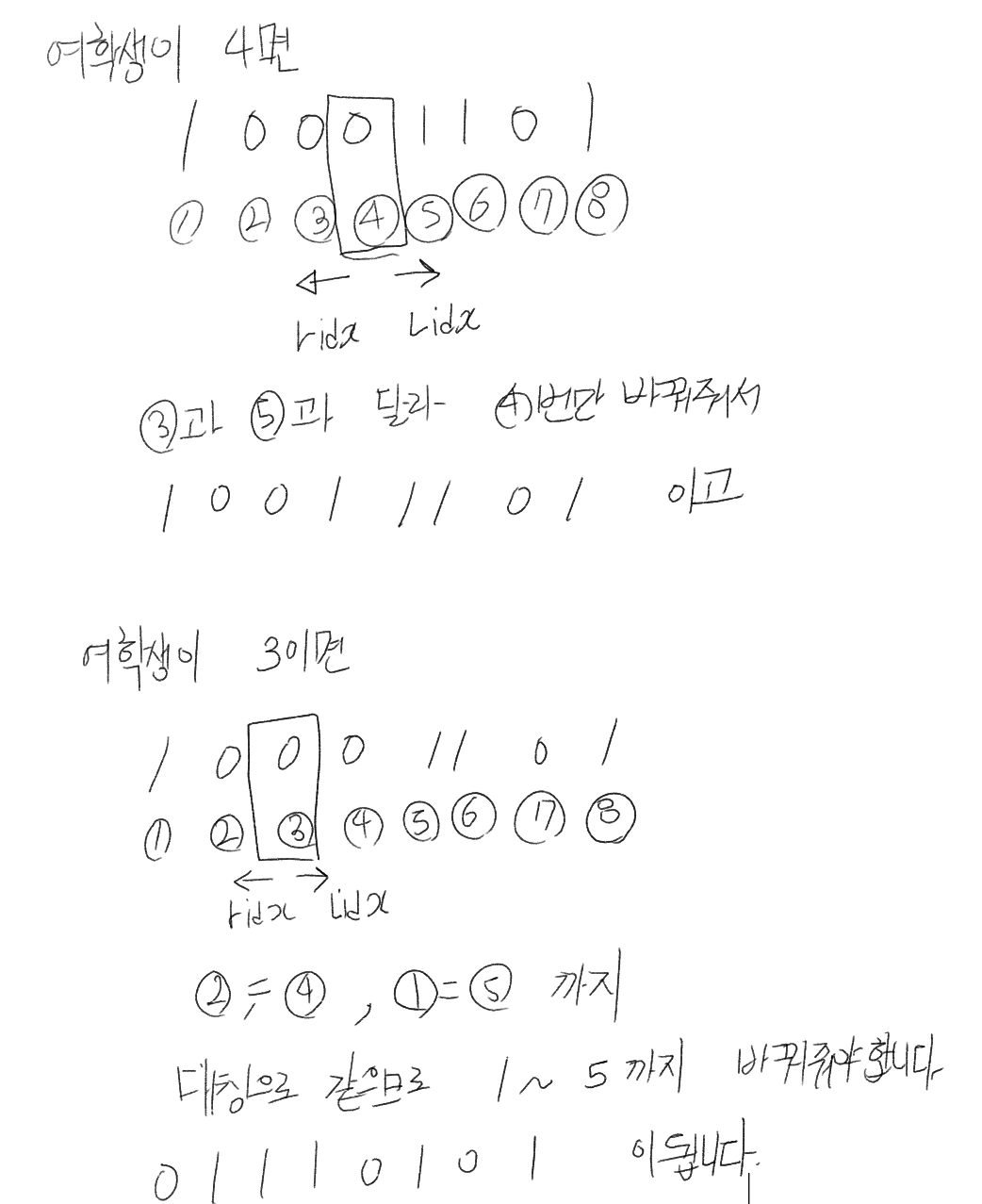 남학생은 다음 숫자에 따라서 1이면 0 0이면 1로 바꿔줘야 하는데