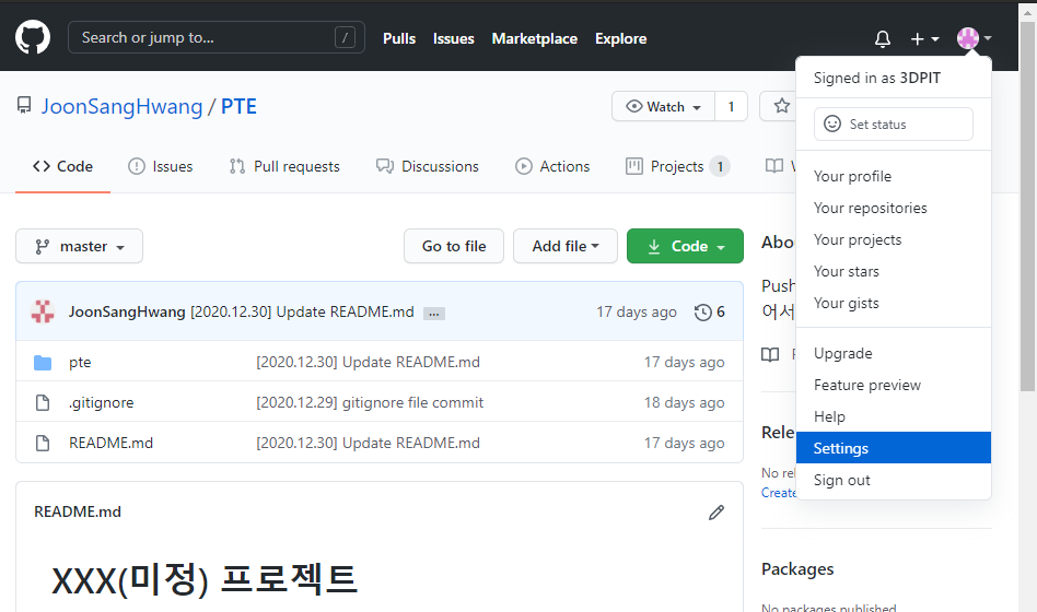 깃헙에 settings 부분에 들어가서