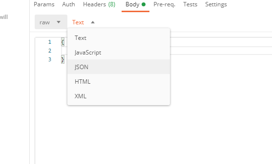 그리고 body 선택 row로 설정해주고 우리가지금 json 형식으로 보낼것인데