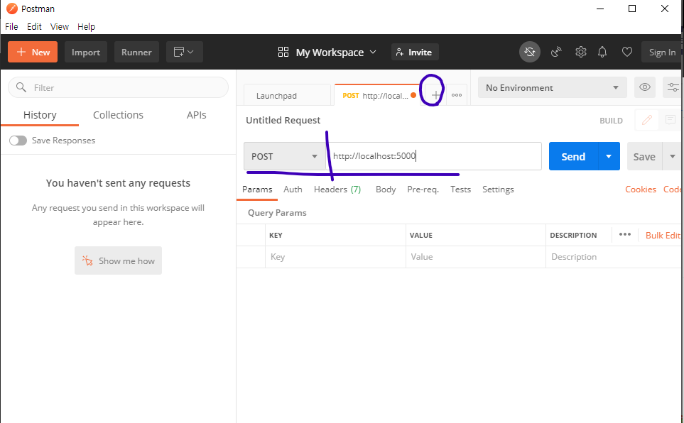 저기 보라색 동그라미 + 를 눌러서 저렇게 post 로 바꾸고 서버의 주소를 넣어줍니다.