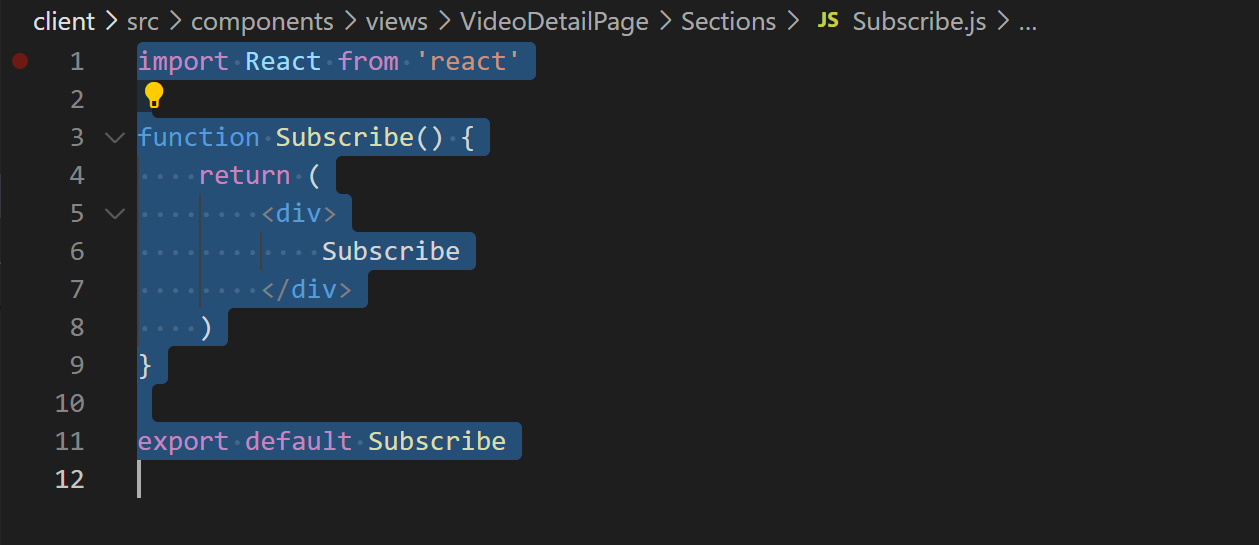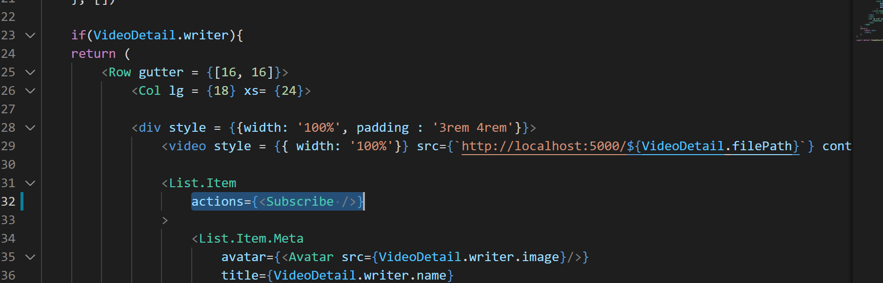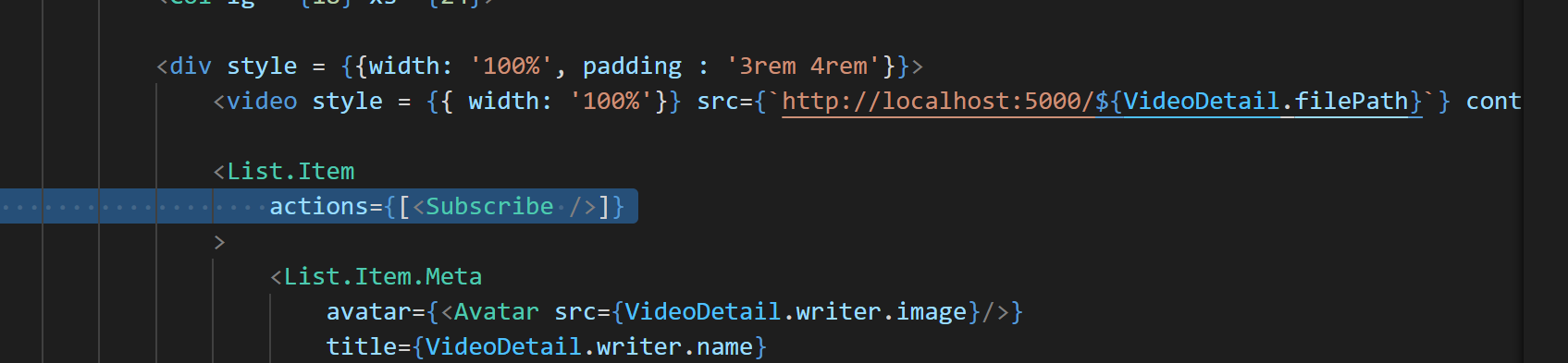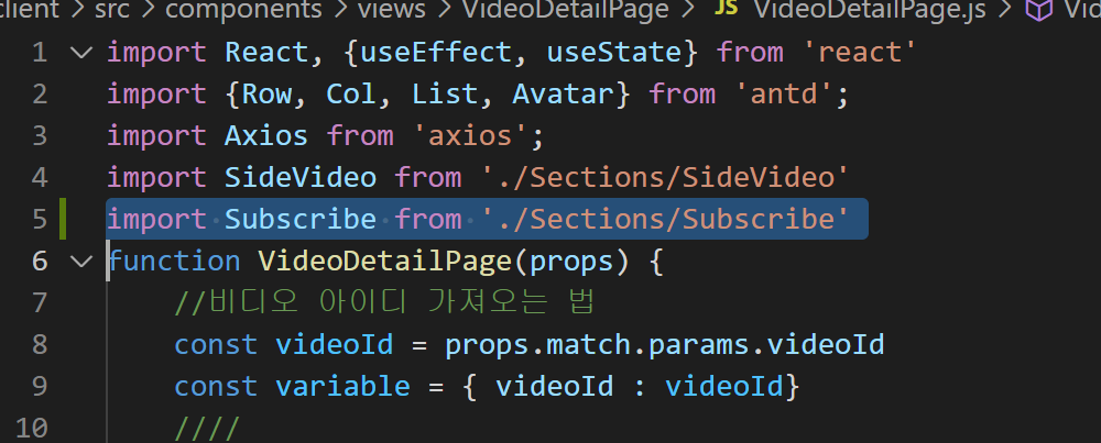 Subscribe.js 파일 생성하고 아래 그림과 같이 비디오 디테일 페이지에 임폴트 시켜주세요.