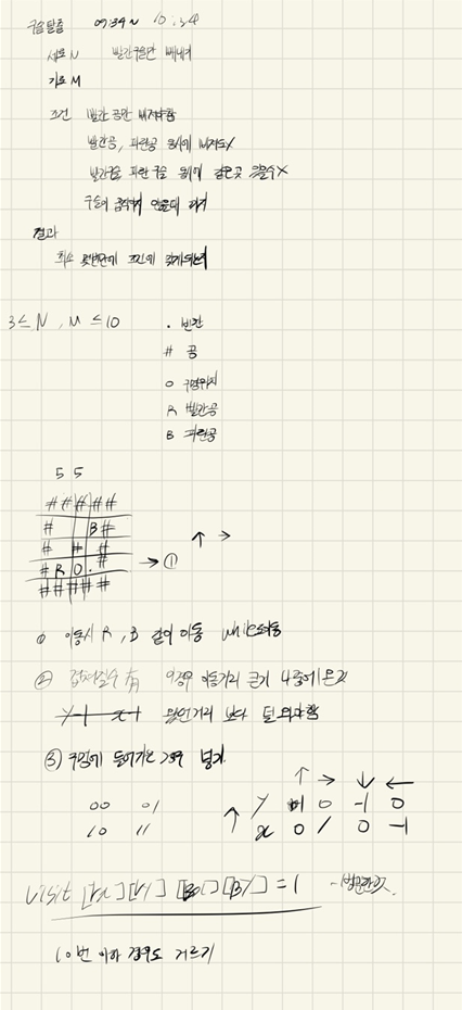 - 파란공과 빨간공이 같은 위치에 있을때 가장 멀리서 온경우 한칸뒤로 가게 해야함