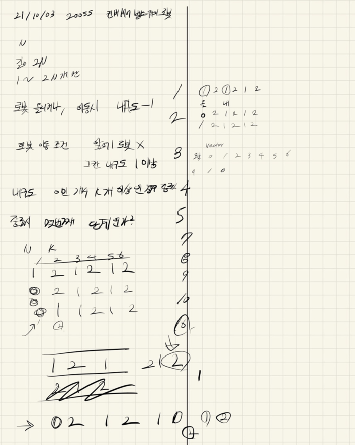 while(zeroCnt<K){// 내구도가 0인 칸의 개수가 K개 이상이라면 과정을 종료한다.그렇지 않다면 1번으로 돌아간다.