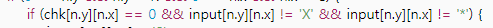 if (chk[n.y][n.x] == 0 && input[n.y][n.x] != 'X' && input[n.y][n.x] != '*') {