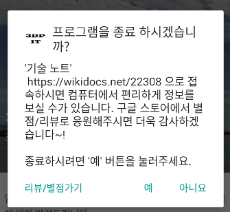 d.setMessage("'3dpitTistory' \n https://3dpit.tistory.com 으로 접속하시면 컴퓨터에서 편리하게 정보를 보실 수가 있습니다. \n\n종료하시려면 '예' 버튼을 눌러주세요.");