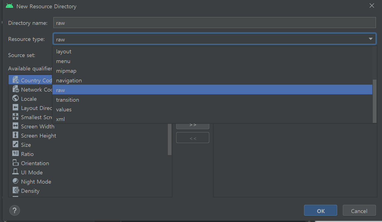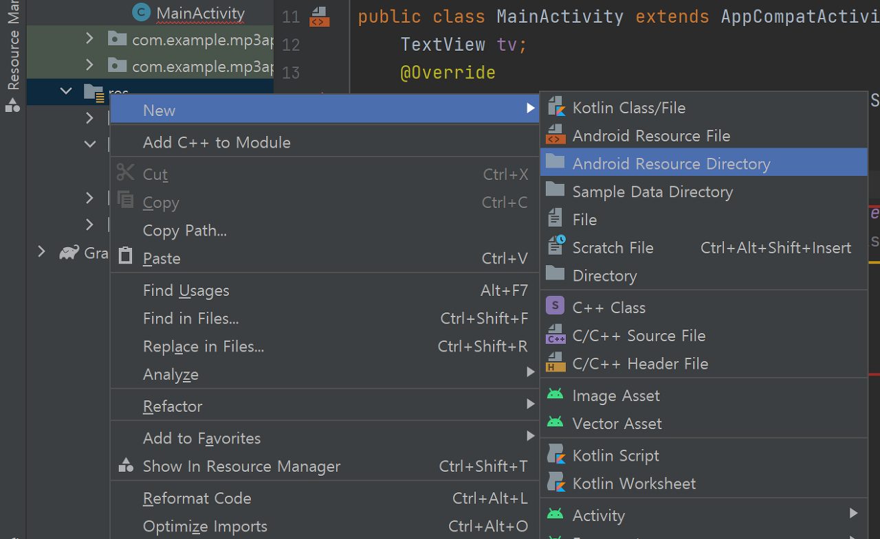 - res 폴더에서 오른쪽 클릭 New -> Android Resource Directory클릭