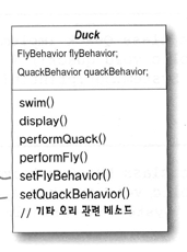 - 그리고 Duck 클래스에서 fly()와 quack()대신 performFly()와 performQuack()이라는 메소드를 집어넣음