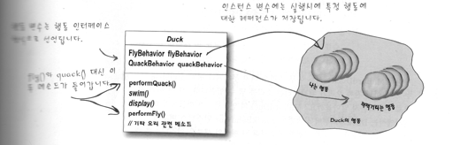 - 각 오리 객체에서는 실행시 이 변수에 특정 행동 형식 (FlyWithWings, Squeak등) 에 대한 레퍼런스를 다형적으로 설정