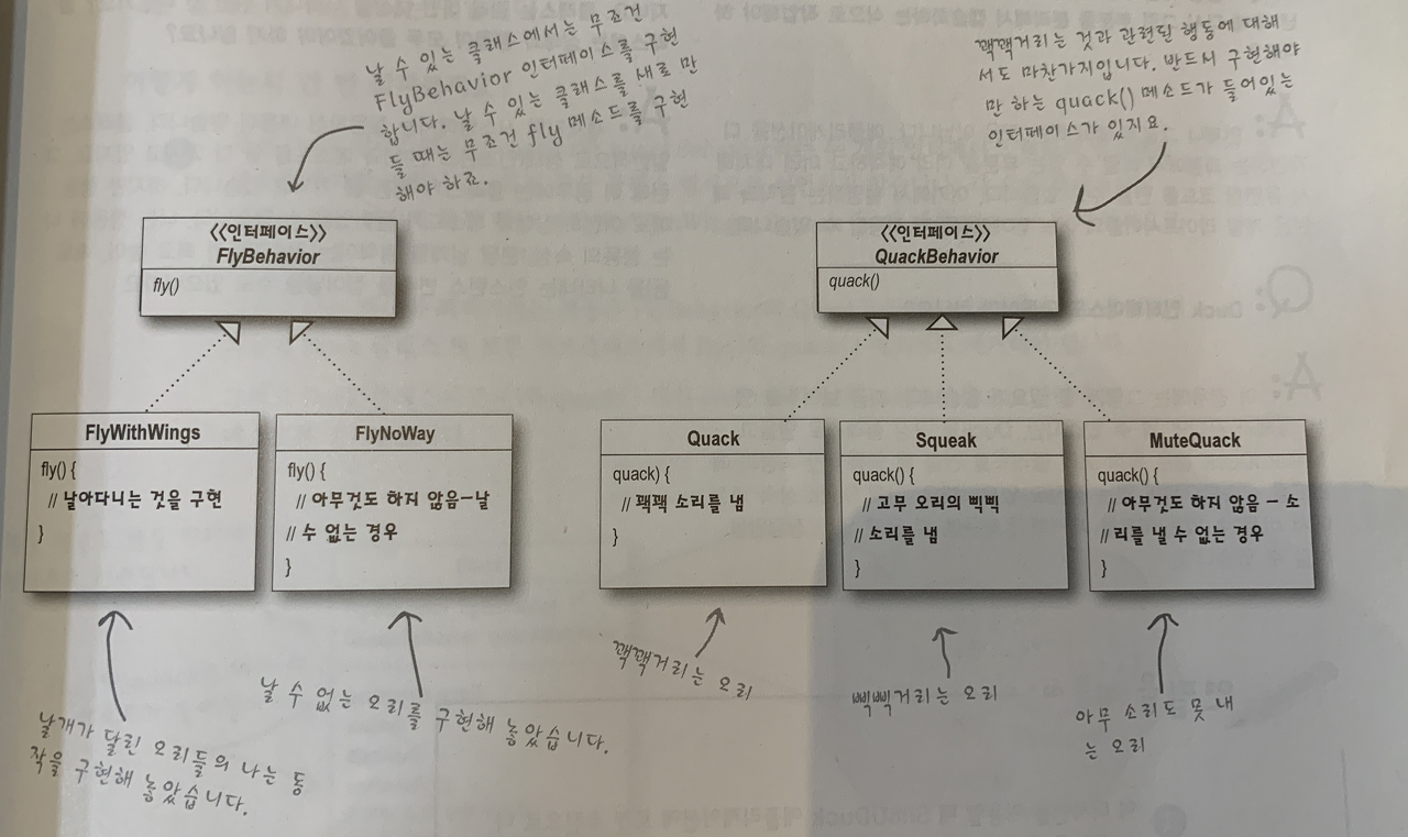 - 각 행동은 인터페이스 (FlyBehavior, QuackBehavior)로 표현하고