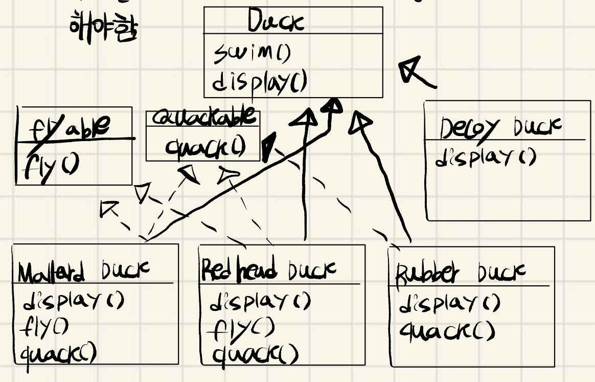 - 서브클래스에서 Flyable, Quackable을 구현하도록 하면, 기능적인 문제는 해결