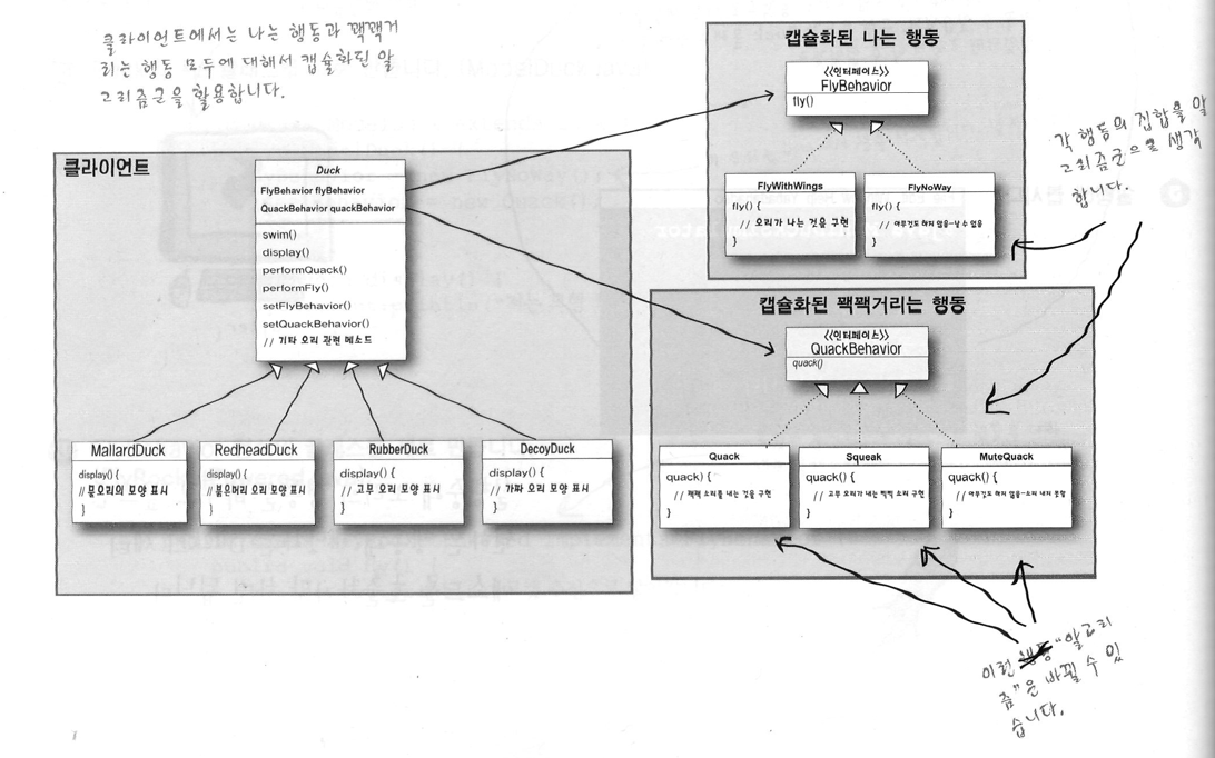 - 각 오리에는 FlyBehavior와 QuackBehavior가 있으며, 각각 행동과 꽥꽥 거리는 행동을 위임 받음