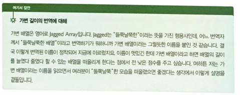- 2차원 배열이나 3차원 배열 같은 다차원 배열을 배열을 요소로 갖는 배열