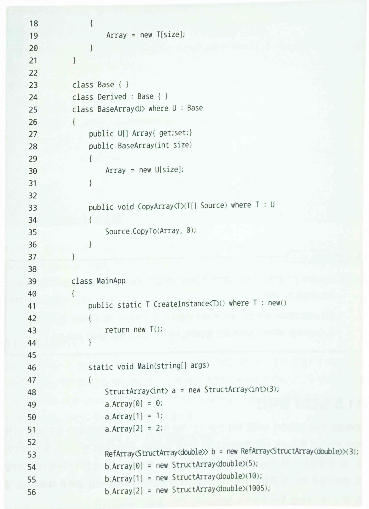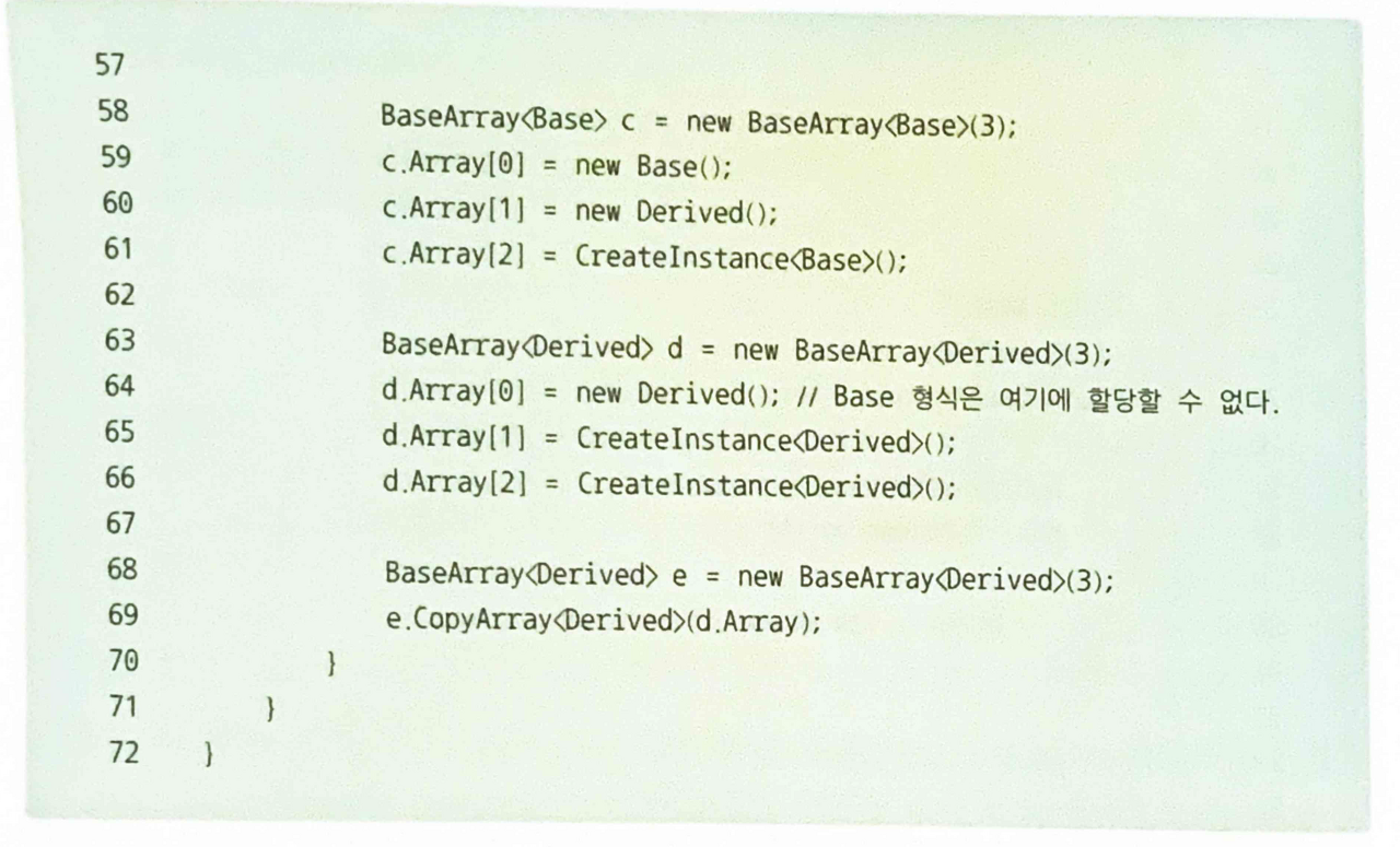- CopyArray() 소속 클래스인 BaseArray의 형식 매게변수 U로부터 T가 상속받아야 할것을 강제하고 있음