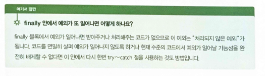 - try 블록의 자원 해제 같은 중요한 코들르 미쳐 실행하지 못하는 경우 이는 곧 버그를 만듦