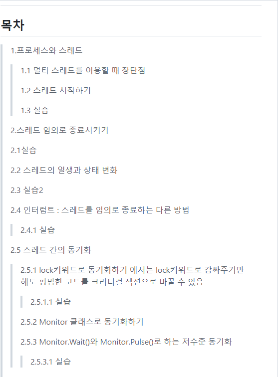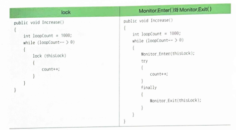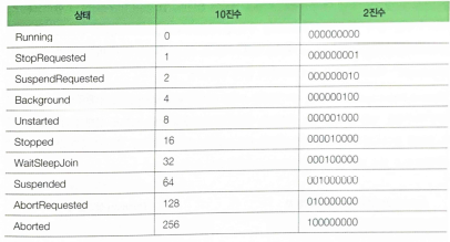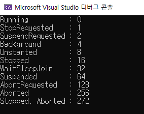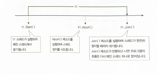 - ThreadStart 대리자가 (무한)반복문을 포함하는 코드를 참조하고 있다면 Abort()메소드를 호출하는 대신 그 반복문을 매회 반복할 때 마다 계속 수행할 것인지 확인하는 변수를 다른 스레드들과 공유하고, 그 변수의 값을 외부 스레드에서 변경토록하는게 낫다