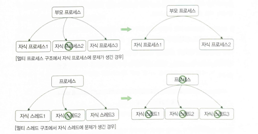 - 멀티스레드 기반의 SW에서는 자식 스레드 중 하나에 문제가 생기면 전체 프로세스에 영향을 줌
