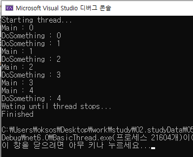 - Thread.Join() 메소드를 호출하여 스레드가 끝날 때까지 기다림
