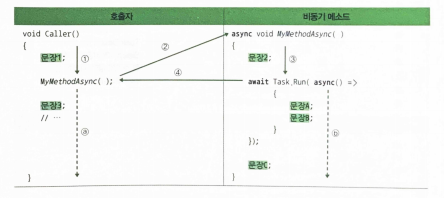 - async 한정자는 메소드, 이벤트 처리기, 태스크, 람다식 등을 수식함으로써 C#컴파일러가 이들을 호출하는 코드를 만날 때 호출 결과를 기다리지 않고 바로 다음 코드로 이동하도록 실행코드를 생성