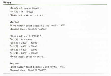 - 아래의 소스는 소수 판정시간 * n 만큼의 시간이 소요되는데, 하지만 m개의 CPU가 있는 시스템에서 m개 만큼의 Task가 n개의 수를 m으로 나눈 만큰 소수를 찾아 작업시간이 줄어듦