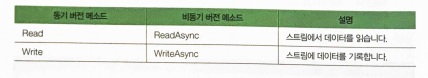 - System.IO.Stream클래스가 제공하는 읽기/쓰기 메소드의 동기 버전과 비동기 버전을 보여줌