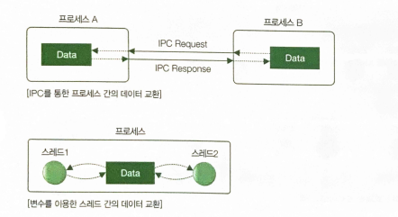 - 프로세스끼리 데이터를 교환하려면 소켓이나 공유 메모리 같은 IPC(Inter Process Communication)을 이용해야 함