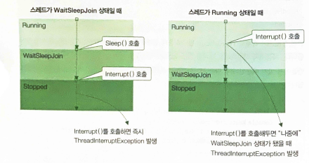 - Abort()메소드가 호출과 동시에 스레드를 즉시 종료하지 않는다는 점