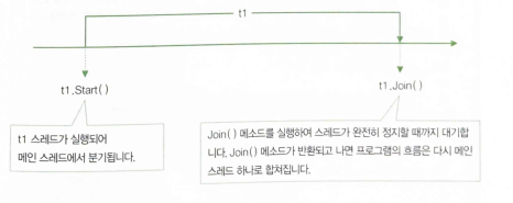 - 아래그림에서처럼 스레드를 하나 실행하면 밧줄에서 실이 한 갈래 빠져 나왔다가 Join() 메소드가 반환되는 시점에서 이 실(스레드)이 다시 밧줄(프로세스)로 합류한다고 생각하면됨
