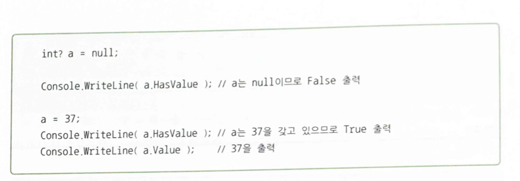 - Nullable 형식은 HasValue와 Value 두가지 속성을 갖고 있음