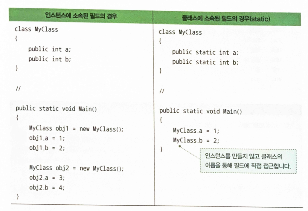 - C#에서 static은 메소드나 필드가 클래스의 인스턴스가 아닌 클래스 자체에 소속되도록 지정하는 한정자