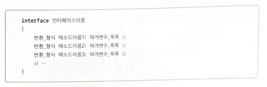 - 이 약속은 인터페이스로 부터 파생될 클래스가 어떤 메소들르 구현해야 할지를 정의함