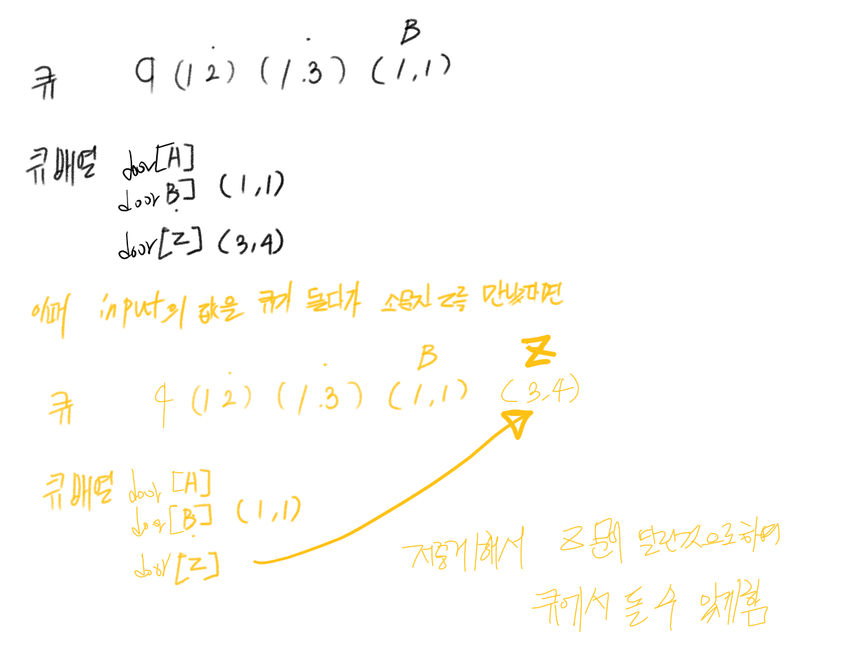 열쇠를 찾았을때 그때 문 위치부터 시작하게 왜 큐에 넣는지 그림으로 설명하자면 이렇습니다.