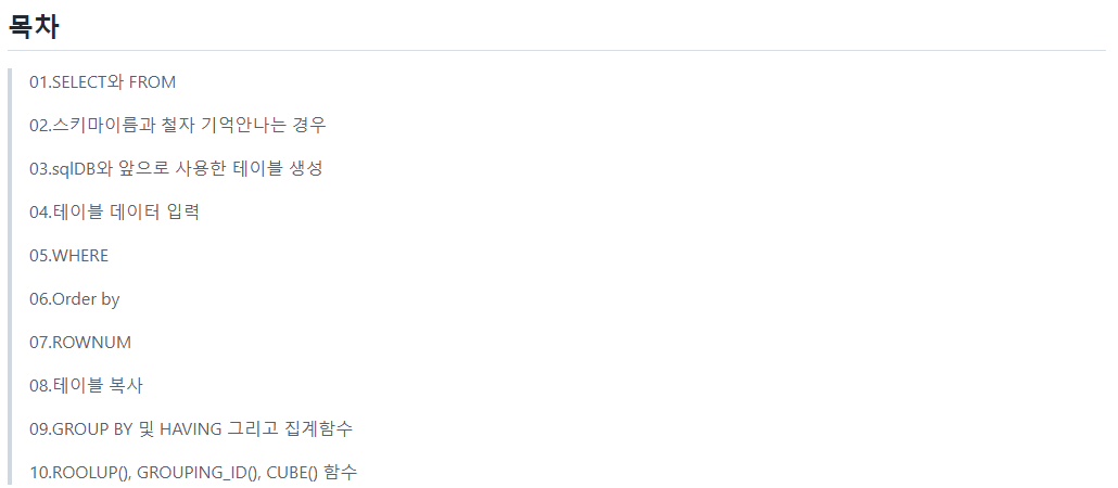 SELECT idNum, groupName, SUM(price*amount) AS "비용" FROM buyTBL GROUP BY ROLLUP (groupName, idNum); SELECT groupName, SUM(price*amount) AS "비용" FROM buyTBL GROUP BY ROLLUP (groupName); SELECT groupName, SUM(price*amount) AS "비용" , GROUPING_ID(groupName) AS "추가행 여부" FROM BUYTBL GROUP BY ROLLUP(groupName); DROP TABLE cubeTBL; CREATE TABLE cubeTBL(prodName NCHAR(3), color NCHAR(2), amount INT); INSERT INTO cubeTBL VALUES('컴퓨터', '검정', 11); INSERT INTO cubeTBL VALUES('컴퓨터', '파랑', 22); INSERT INTO cubeTBL VALUES('모니터', '검정', 33); INSERT INTO cubeTBL VALUES('모니터', '파랑', 44); SELECT prodName, color, SUM(amount) AS "수량합계" FROM cubeTBL GROUP BY CUBE(color, prodName) ORDER BY prodName, color; - Postgers | grouping_id는 없음
