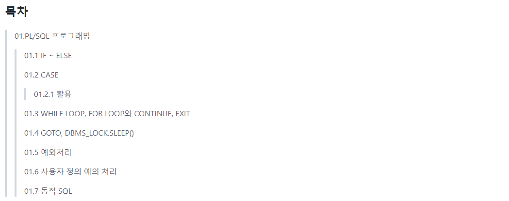 DECLARE iNum NUMBER(3) ; -- 1에서 100까지 증가할 변수 hap NUMBER(5) ; -- 더한 값을 누적할 변수 BEGIN iNum := 1; hap := 0; WHILE iNum <= 100 LOOP IF MOD(iNum, 7) = 0 THEN iNum := iNum + 1; CONTINUE; END IF; hap := hap + iNum; -- hap에 iNum를 누적시킴 IF hap > 1000 THEN GOTO my_goto_location; END IF; iNum := iNum + 1; -- iNum을 1 증가시킴 END LOOP; << my_goto_location >> DBMS_OUTPUT.PUT_LINE(hap); END ; BEGIN DBMS_LOCK.SLEEP(5); DBMS_OUTPUT.PUT_LINE('5초간 멈춘후 진행되었음'); END ; - Postgres | goto 안됨