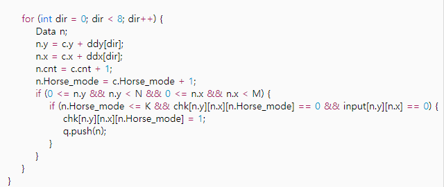 if (n.Horse_mode <= K && chk[n.y][n.x][n.Horse_mode] == 0 && input[n.y][n.x] == 0) {
