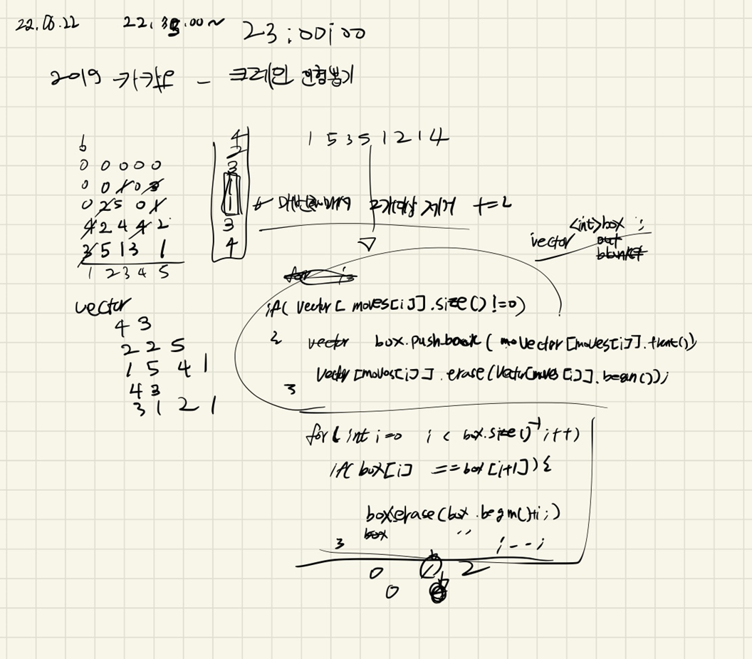 for (int j = 0; j < board.size(); j++) {//뽑아내기 for (int i = 0; i < board.size(); i++) { if (board[i][j] != 0) { lineDoll[j].push_back(board[i][j]); } } }