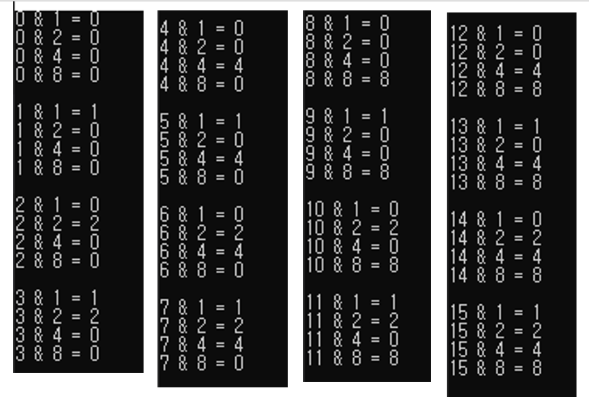 for (int mask = 0; mask < 16; mask++) { for (int i = 0; i < 4; i++) { cout << mask <<" & "<< (1<<i) << " = " << (mask & (1 << i)) << endl; } cout<<endl; }