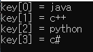 string inf = "java and c++ and python and c#"; string key[4], rm; istringstream iss(inf); iss >> key[0] >> rm >> key[1] >> rm >> key[2] >> rm >> key[3]; cout << "key[0]" << " = " << key[0] << endl << "key[1]" << " = " << key[1] << endl << "key[2]" << " = " << key[2] << endl << "key[3]" << " = " << key[3] << endl; - 실제 사용 소스
