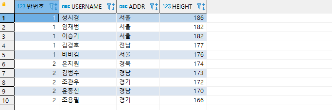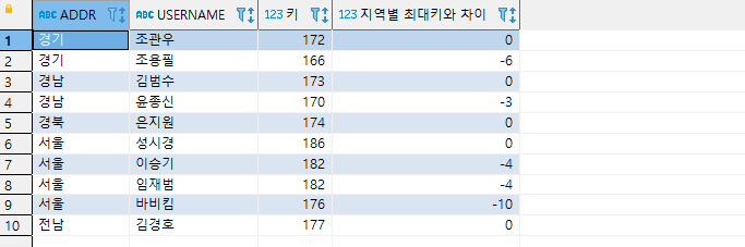 -- 지역별 순위 SELECT addr, ROW_NUMBER( ) OVER(PARTITION BY addr ORDER BY height DESC, userName ASC) "지역별키큰순위", userName, height FROM userTbl ; -